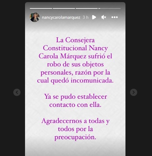 "Sufrió el robo de sus objetos personales, razón por la cual quedó incomunicada. Ya se pudo establecer contacto con ella", señalaron.