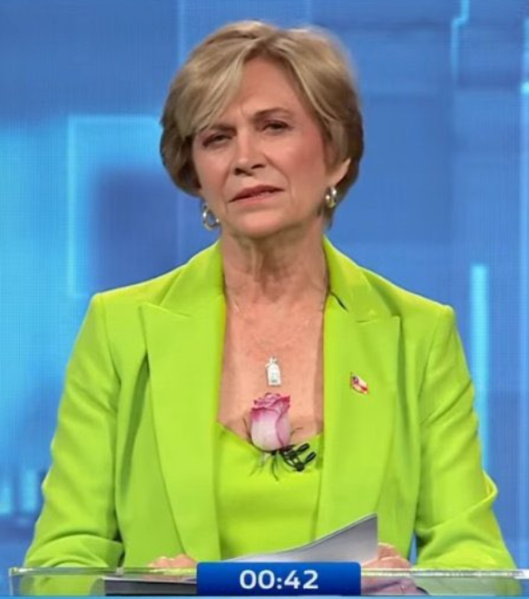 La candidata recibió el obsequio con una sonrisa y lo colocó en un particular lugar, donde permaneció incluso durante su propio minuto de cierre, gesto que no pasó desapercibido entre los presentes ni en redes sociales.