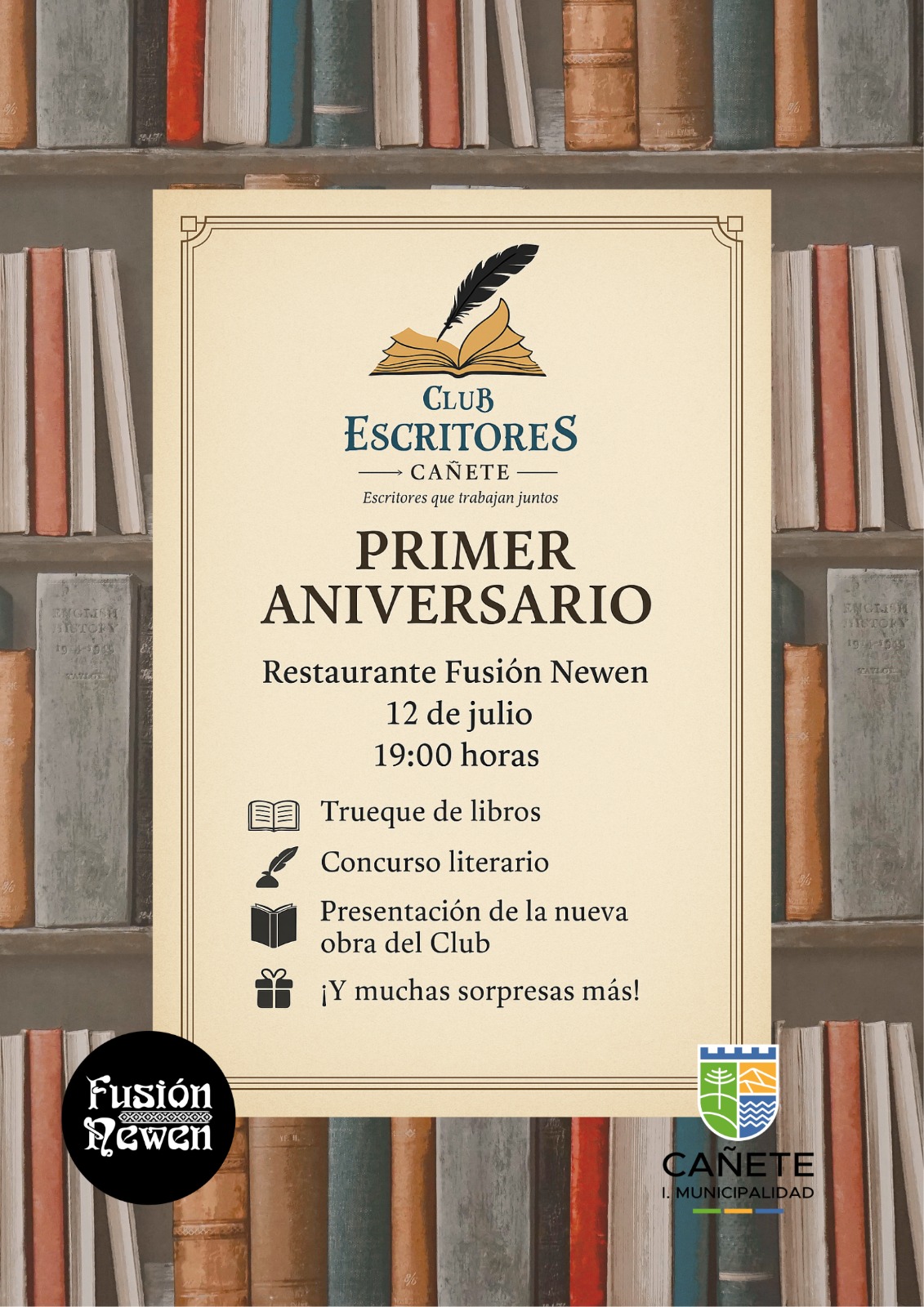 La Municipalidad de Cañete tiene el agrado de invitar a la comunidad al primer aniversario del Club de Escritores Cañete, una iniciativa cultural que ha reunido durante el último año a escritoras y escritores locales en torno al amor por las letras y la creación literaria.