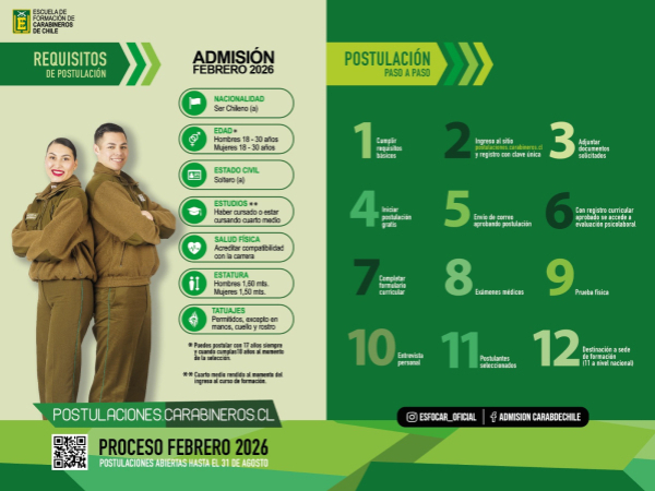 ESCUELA DE FORMACIÓN POLICIAL DE CARABINEROS DE CHILE INVITA A POSTULAR PARA INGRESO FEBRERO 2026