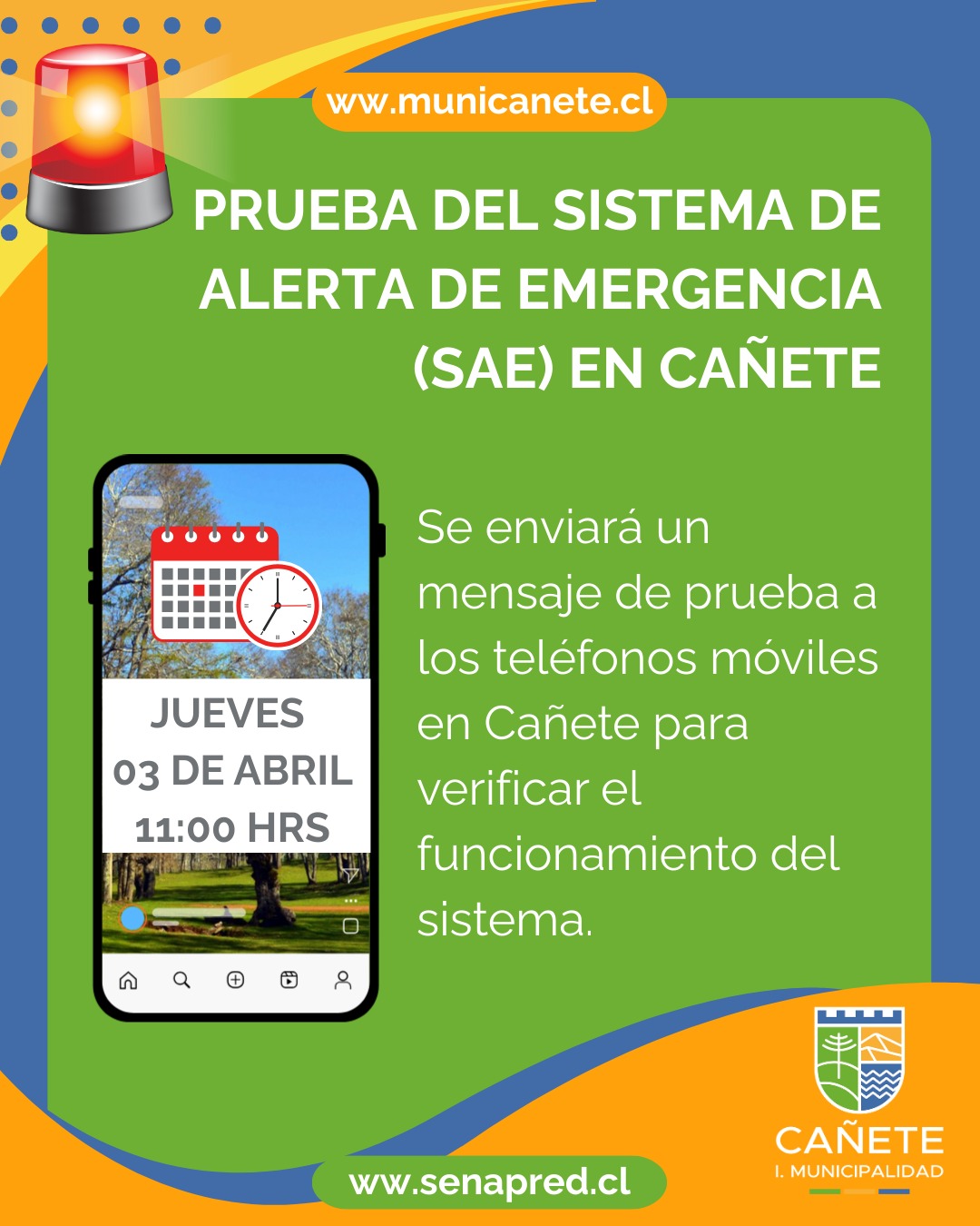 Se enviará un mensaje de prueba a los teléfonos móviles en Cañete para verificar el funcionamiento del sistema.