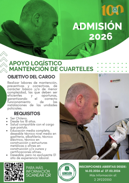 Carabineros de Chile abrió proceso Nacional de postulaciones para cargos de Apoyos Logísticos, los cuales son para formar parte de la Planta Institucional en diversas áreas tales como: Auxiliar de Almacén, Conductores de Vehículos, Garzón, Mantención de Cuarteles, Mecánico Automotriz y Rancheros; todos ellos ya disponibles para concursar a través de la plataforma postulaciones.carabineros.cl.